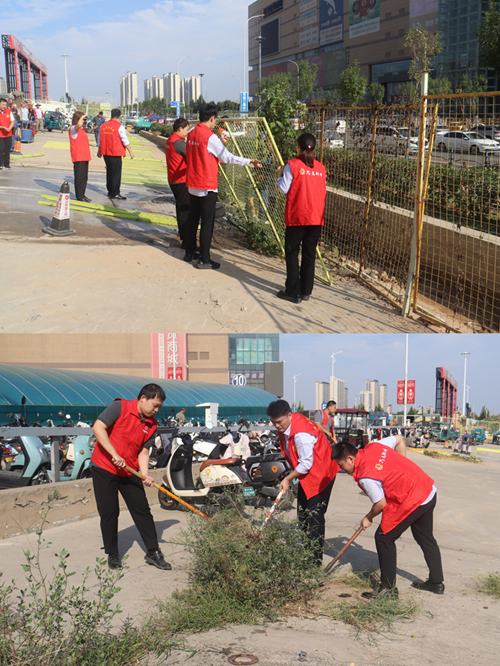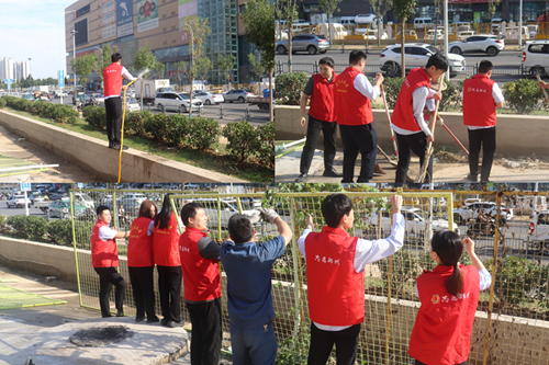 9月24日,新商城運營公司黨支部組織開展“環境衛生整治”主題黨日活動,弘揚“奉獻、友愛、互助、進步”的志愿精神?;顒又?,黨員志愿者身著紅馬甲,協作拆除商城外圍陳舊圍擋,清理地面雜草垃圾,并拿起水管,給周邊綠化帶中的植物澆水,草叢在灌溉下愈顯生機。